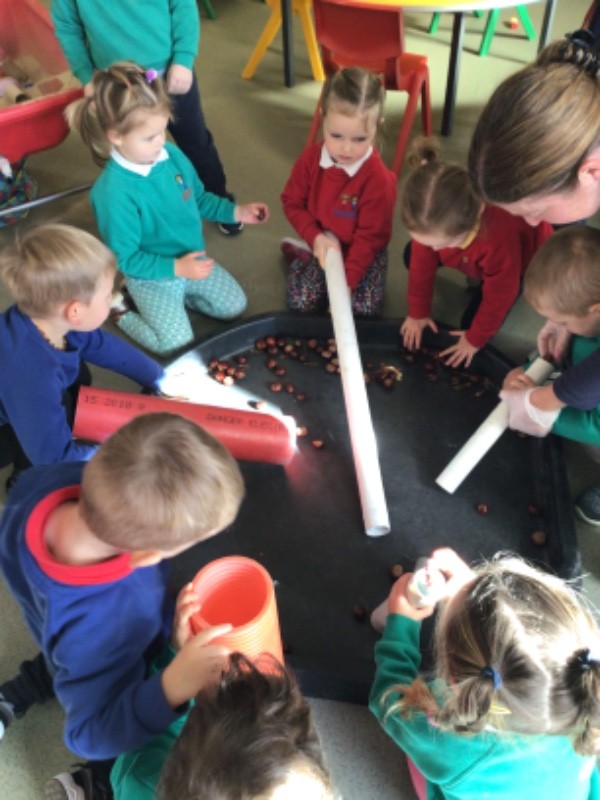 This week the children have been exploring Autumn natural materials. They have been doing leaf rubbings, pouring conkers down tubes and talking about animals such as hedgehogs and foxes. They are enjoying dressing up and wearing high heels and hats. Water play has been focused on the skills of pouring and filling.