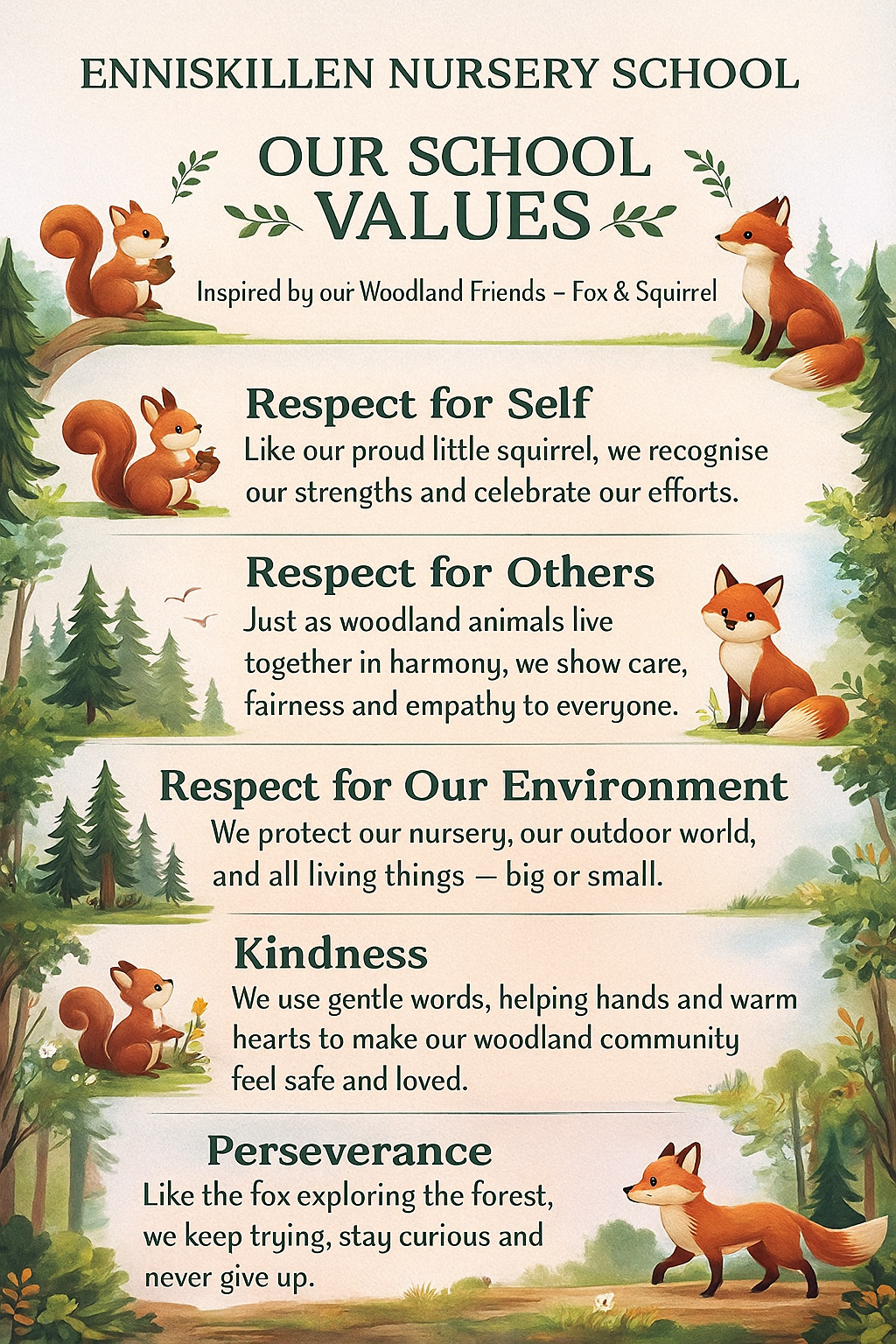 'At Enniskillen Nursery school, we welcome everyone with a big smile. Every child is valued. We help the children feel safe, cared for, happy and excited to learn. Together we play, make new friends, ask lots of questions and discover the world around us - one step at a time!'